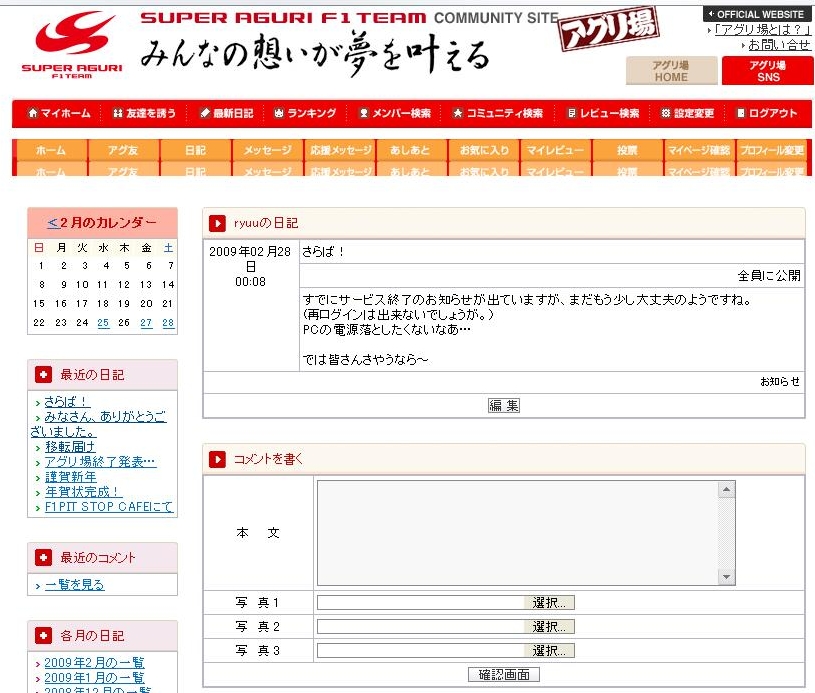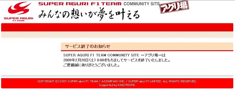 http://sns.saf1.co.jp/ 2007年6月からお世話になりました。 皆さんありがとうございました。m(_ _)m ロスタイムで1件投稿してみました^^;見てくれた人いたのかな? 0時10分過ぎにはもう見ることは出来ませんでしたが。